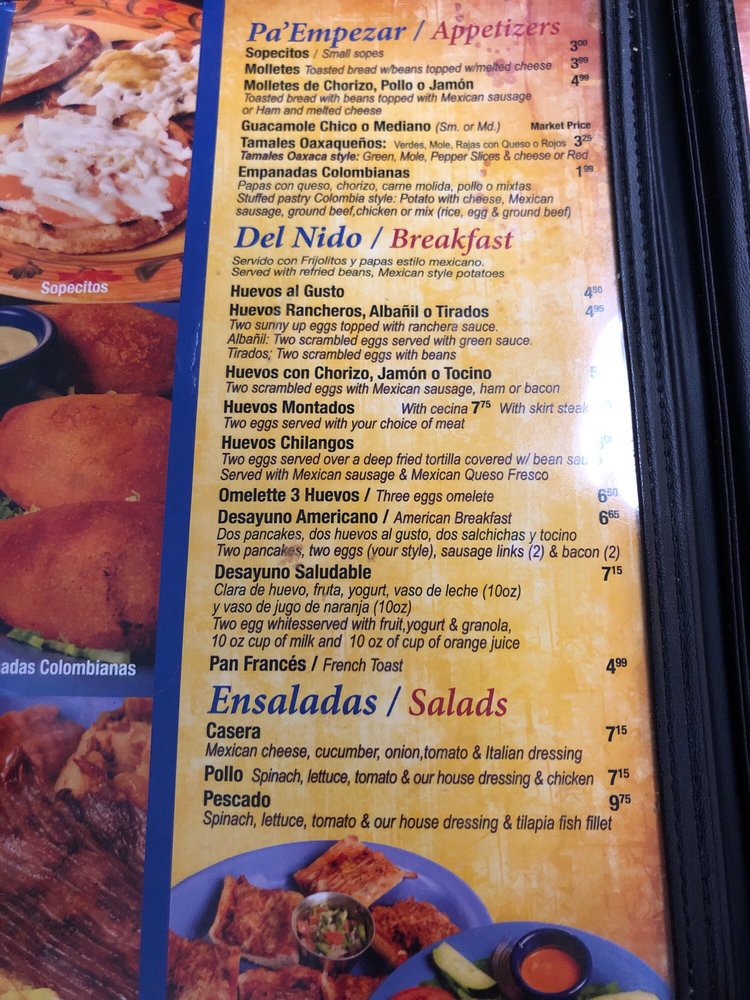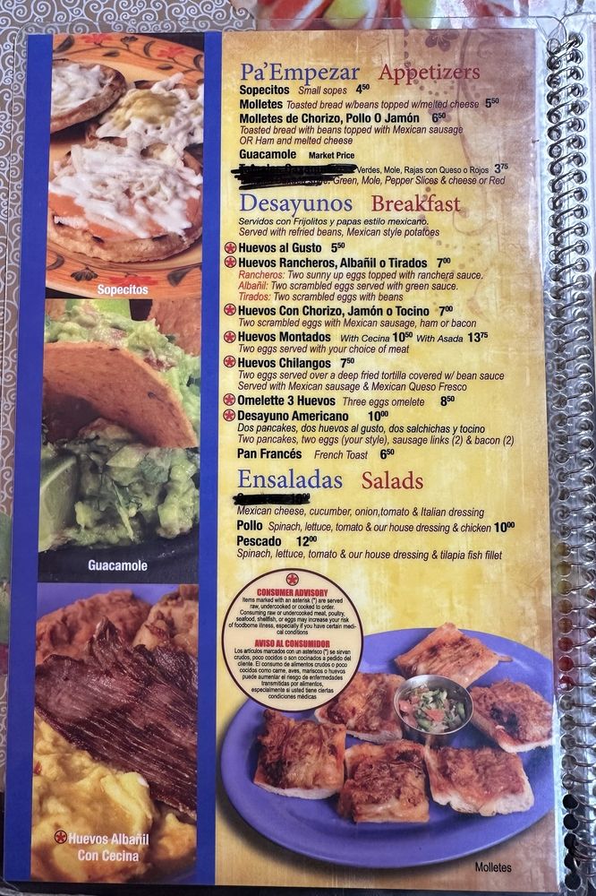 Two sunny up eggs topped with ranchera sauce. Albanil: two scrambled eggs served with green sauce. Tirados: two scrambled eggs with beans